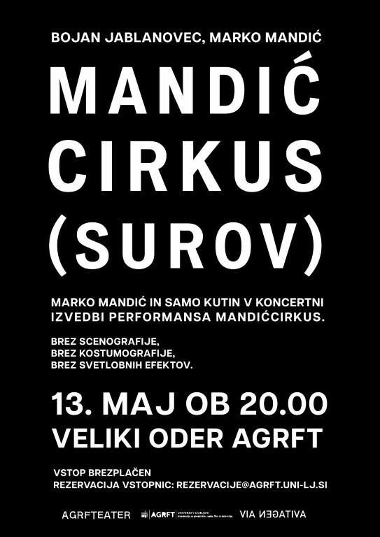 Velika gledališka dvorana, AGRFT Aškerčeva 5, LjubljanaV torek, 13. 5. 2025, ob 20.00 bo v Veliki gledališki dvorani UL AGRFT predstava Bojana Jablanovca in Marka Mandića MandićCirkus (surov). Vstop je prost, vendar morate svoje vstopnice rezervirati na is.jl1766715350-inu.1766715350tfrga1766715350@ejic1766715350avrez1766715350er1766715350. Gostovanje poteka v sodelovanju med Odprto katedro UL AGRFT in Vio Negativo. MandićCirkus (surov) Marko Mandić in Samo Kutin v koncertni izvedbi performansa […]