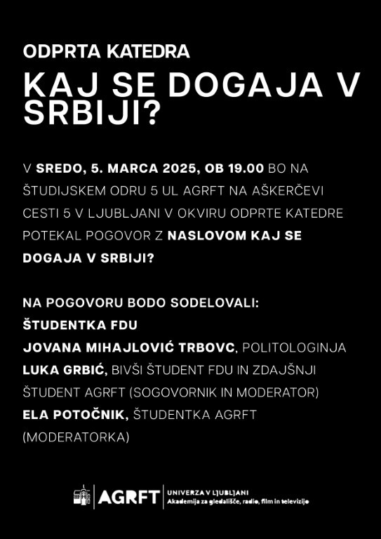 Študijski oder 5, AGRFT Aškerčeva 5, LjubljanaV sredo, 5. marca 2025, ob 19.00 bo na Študijskem odru 5 UL AGRFT na Aškerčevi cesti 5 v Ljubljani v okviru Odprte katedre potekal pogovor z naslovom Kaj se dogaja v Srbiji? Na pogovoru bodo sodelovali: študentka Fakultete dramskih umetnosti (FDU) Univerze umetnosti v Beogradu Jovana Mihajlović Trbovc, politologinja Luka Grbić, bivši študent FDU […]