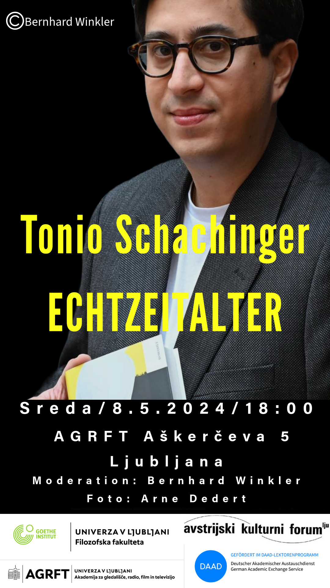 Velika gledališka dvorana, AGRFT Aškerčeva 5,LjubljanaTonio Schachinger, rojen leta 1992 v New Delhiju, je študiral nemški jezik in književnost na Univerzi na Dunaju ter kreativno pisanje na Univerzi za uporabne umetnosti na Dunaju. Za svoj prvi roman Nicht wie ihr je prejel nagrado za mlade avtorje mesta Bremen in se leta 2019 uvrstil v ožji izbor za nemško knjižno nagrado, […]